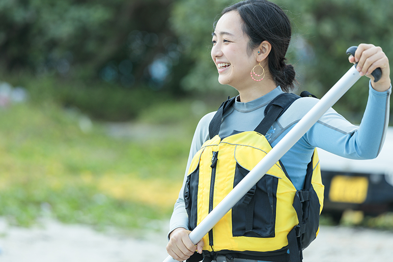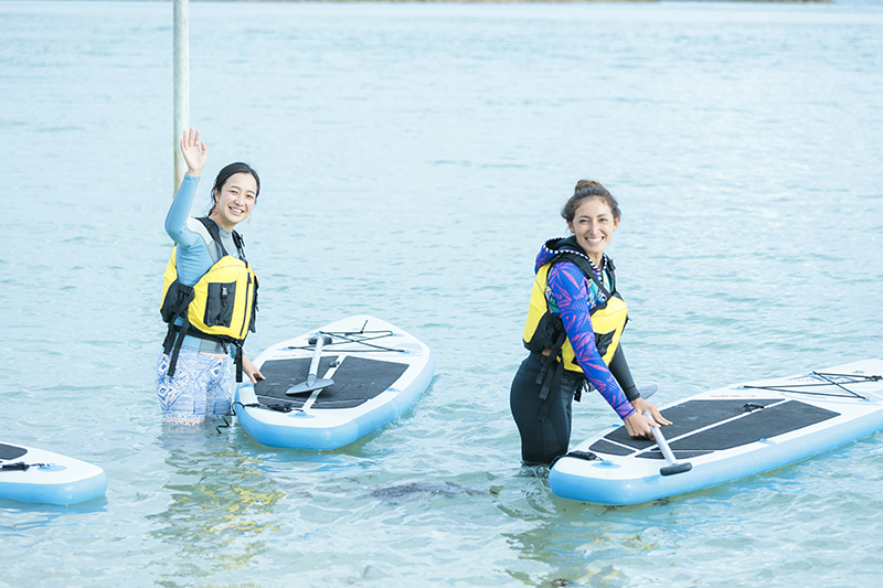 今回、あえて15:00スタートという遅めの時間帯を選んだのは、夕暮れ時のドラマチックな海でSUPをしてみたかったから。このエリアの空と海を毎日見ている田中さんも、「15時頃は海の色がすごくきれいで、日暮れ頃になると太陽の光が優しいオレンジ色に変わって美しいですよ」と教えてくれた。この日は少し雲が多めだったけれど、雲の隙間からシャワーのように降り注ぐ光が神々しくて、心が洗われるようなひとときを過ごせた。